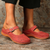 Simply, slip them on and snug your feet in place around the toe clasp for enhanced support.
