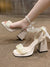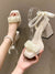 Fashion Beige Sandals For Women, Faux Pearl Decor Ruched Detail Chunky Heeled Ankle Strap Sandals